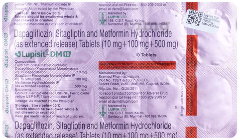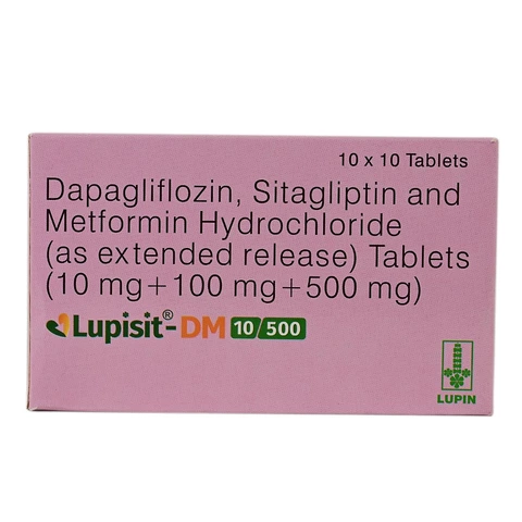 Lupisit DM 10mg/500mg/100mg Tablet is a combination medicine that contains Dapagliflozin (10mg), Metformin (500mg), and Sitagliptin (100mg). It is prescribed for the management of type 2 diabetes mellitus when single or dual therapy is not enough to control blood sugar. The three medicines work together to reduce sugar production in the liver, improve insulin response, and increase glucose removal through urine.