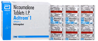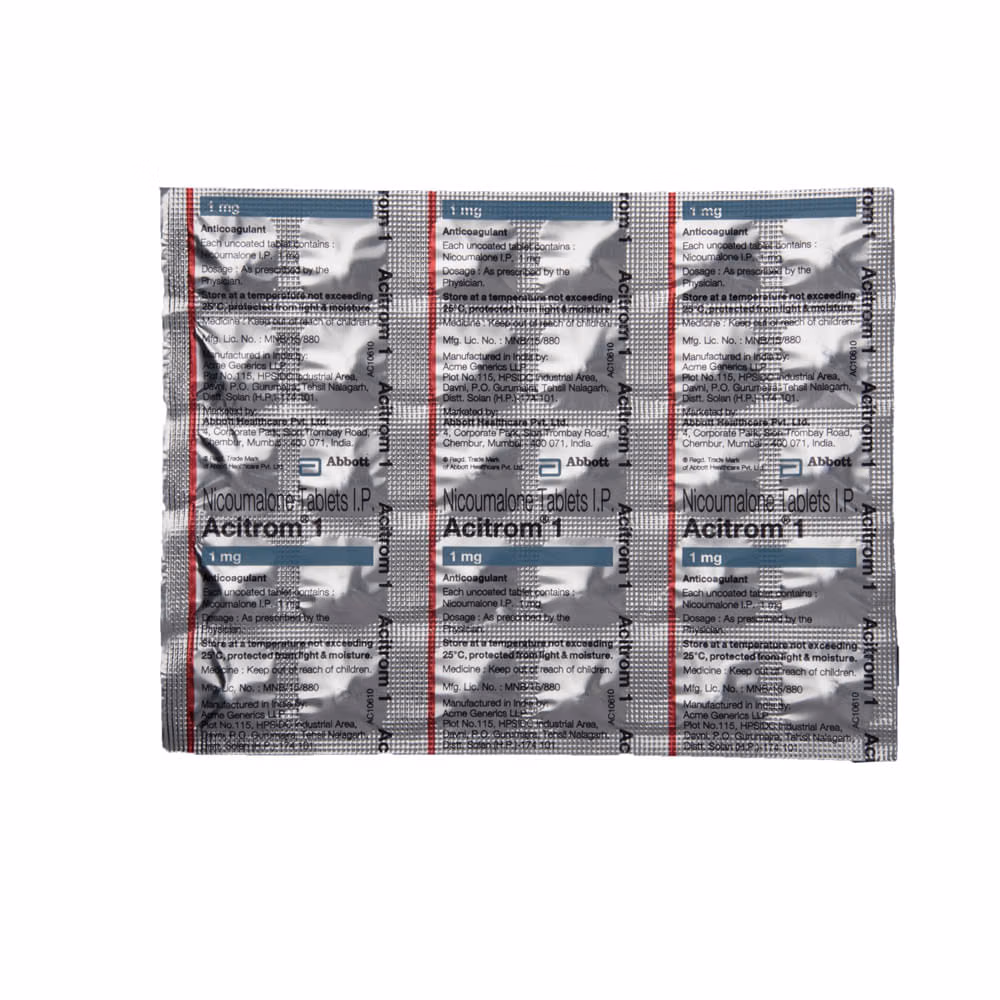 Acitrom 1 Tablet is a medicine used to keep the blood from clotting in a harmful way. It is commonly given to people who have conditions like deep vein thrombosis, pulmonary embolism, stroke, or heart-related clotting problems. By reducing the risk of clot formation, it helps protect vital organs such as the brain, lungs, and heart.