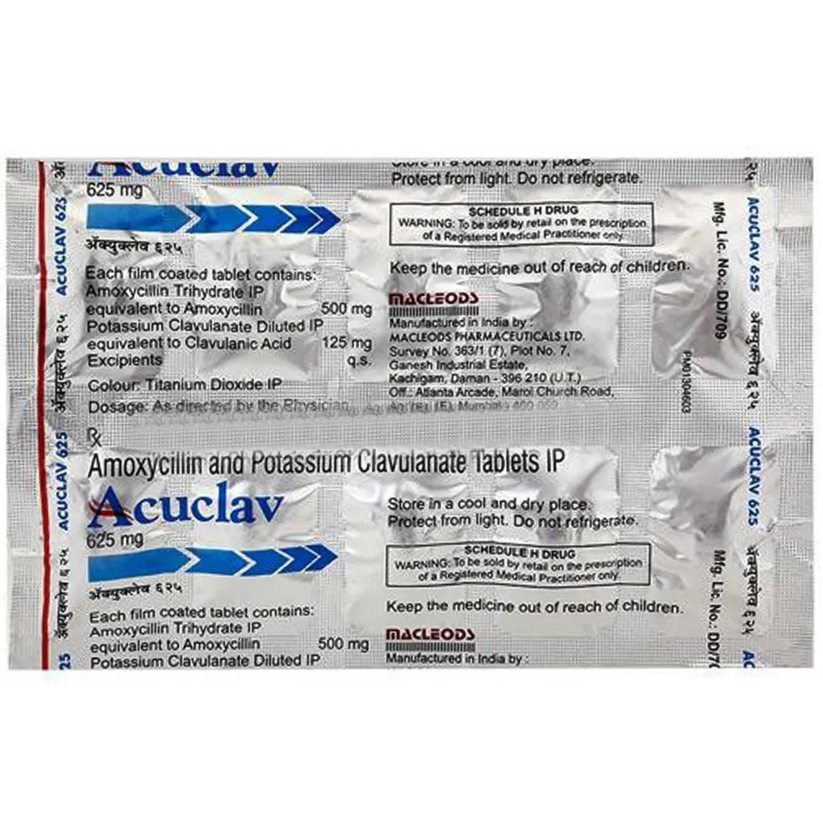 Acuclav 625 Tablet is used for treating bacterial infections in various areas such as the throat, lungs, urinary system, skin, bones, joints, teeth, and ears. It works by combining two medicines: Amoxycillin, which kills bacteria by stopping the formation of their protective covering, and Clavulanic Acid, which prevents bacterial resistance and strengthens the effect of Amoxycillin.