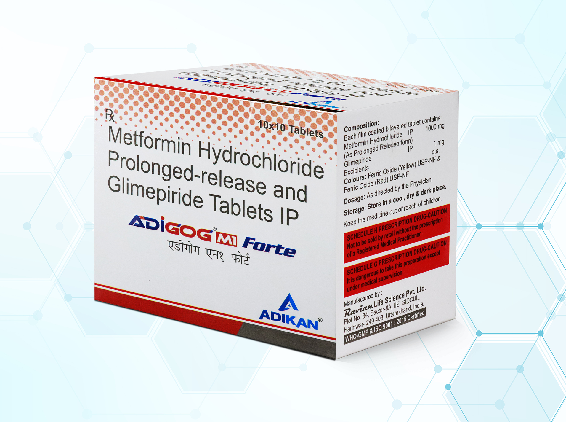 Adigog M1 Forte is an oral medicine used in the treatment of type 2 diabetes when diet, exercise, or single‑drug therapy fail to achieve adequate blood sugar control. It helps lower blood sugar and improve how the body uses insulin. The dose and frequency are determined by your doctor according to your blood glucose levels, kidney and liver function, and other health factors. This medicine must be taken with meals to help reduce gastrointestinal side effects. It is important to use it consistently every day, even if you feel well, since missing doses can allow blood sugar to rise and cause complications. Possible side effects include stomach upset, nausea, diarrhea, metallic taste, headache, and the risk of low blood sugar (hypoglycemia), especially if meals are skipped or other medicines that lower glucose are used. If symptoms like sweating, dizziness, shaking or confusion occur, seek medical advice. People with impaired kidney or liver function, heart disease, or those who are pregnant or breastfeeding should consult their doctor before using this medication. Also avoid excessive alcohol intake, maintain a healthy diet, lose weight if advised, and increase physical activity, as these help the medicine work better. Take the tablets whole, do not crush or pulverize them. Store the medication in a cool dry place, away from moisture and out of reach of children.