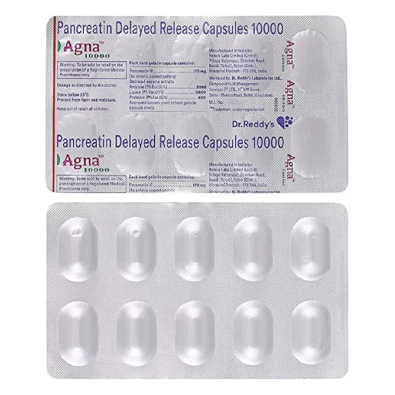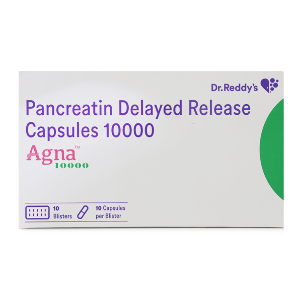 Agna 10000 Capsule DR is a medicine used for people who do not produce enough digestive enzymes naturally. It contains pancreatic enzymes that help break down fats, proteins, and carbohydrates, making it easier for the body to absorb nutrients. By supporting digestion, it can also lessen stomach discomfort and reduce the frequency of loose stools.