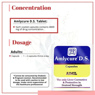 Aimil Amlycure D.S. Capsule is a **double-strength Ayurvedic liver tonic** formulated to support **liver health, detoxification, and regeneration**. It helps restore normal liver function, improves digestion, and protects the liver from harmful toxins, alcohol, infections, and drugs. This capsule is useful in the management of **fatty liver, jaundice, hepatitis, and other hepatic disorders**.