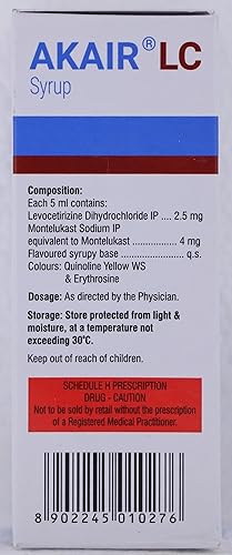 Akair LC Syrup is commonly prescribed for children to manage various allergic conditions, including hay fever, asthma, and allergic skin issues. It helps in reducing symptoms such as sneezing, runny nose, watery eyes, itching, and breathing difficulties that occur due to allergic reactions. These symptoms are caused when the immune system reacts to substances like pollen, dust, or other allergens.