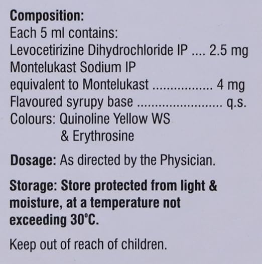 The syrup contains two active ingredients: Montelukast and Levocetirizine. Montelukast works by blocking leukotrienes, natural substances in the body that cause swelling and inflammation in the airways and nose. Levocetirizine helps by blocking histamine, a chemical responsible for allergy-related symptoms like itching and sneezing. Together, they provide comprehensive relief from allergy symptoms and help improve breathing in children.