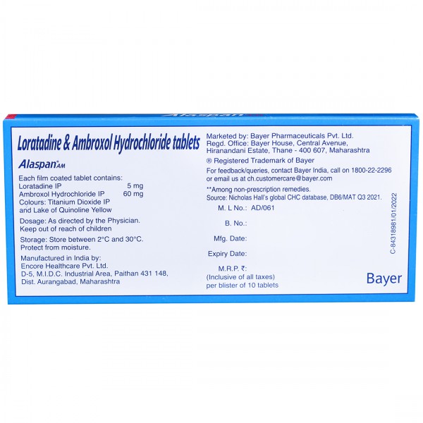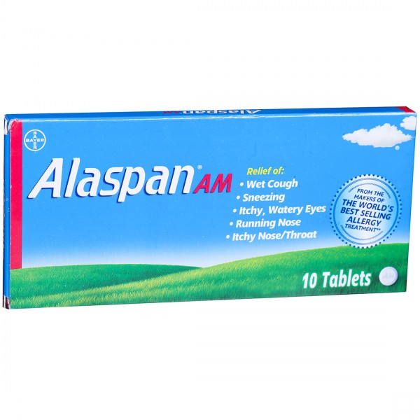 Alaspan AM Tablet is a combination medicine used in the treatment of cough. It relieves allergy symptoms such as sneezing, running nose, watery eyes, itching, swelling, and congestion or stuffiness. It also thins and loosens mucus, making it easier to cough out. Alaspan AM Tablet is taken with or without food in a dose and duration as advised by the doctor. The dose you are given will depend on your condition and how you respond to the medicine. You should keep taking this medicine for as long as your doctor recommends. If you stop treatment too early your symptoms may come back and your condition may worsen. Let your doctor know about all other medications you are taking as some may affect, or be affected by this medicine. The most common side effects are stomach upset, headache, and allergic reactions. Most of these are temporary and usually resolve with time. Contact your doctor straight away if you are at all concerned about any of these side effects. This medicine can also cause dizziness and sleepiness, so do not drive or do anything that requires mental focus until you know how this medicine affects you. Avoid drinking alcohol while taking this medicine as it can make dizziness worse. Never support self-medication or recommend your medicine to another person. It is beneficial to have plenty of fluids while taking this medication. Before taking it, you should tell your doctor if you have any kidney and liver diseases. Pregnant or breastfeeding women should also consult their doctor before taking this medicine.