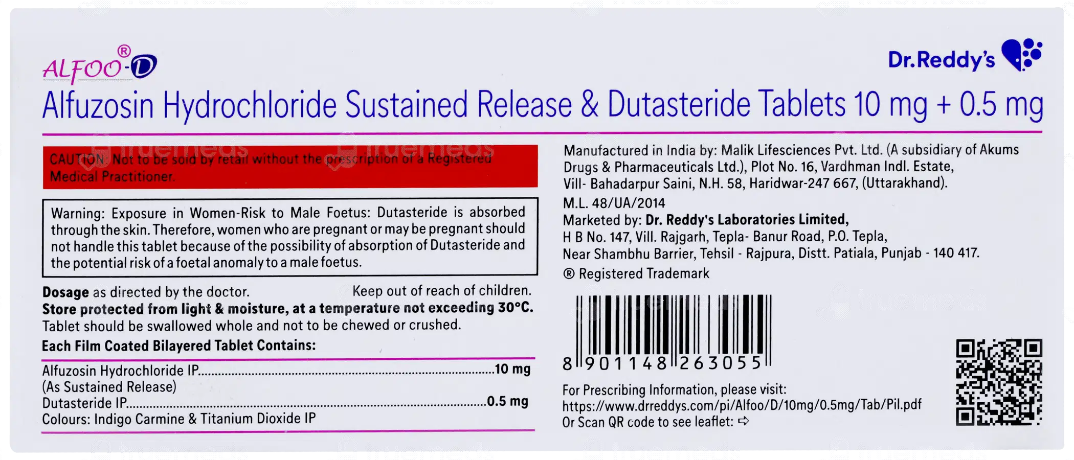 Alfoo-D Tablet SR is a medicine given to men for the management of an enlarged prostate gland, a condition also known as benign prostatic hyperplasia. It helps reduce urinary difficulties such as poor flow, frequent urination, or the sudden urge to pass urine. This treatment does not work against prostate cancer but is focused on easing urinary problems linked to prostate enlargement.