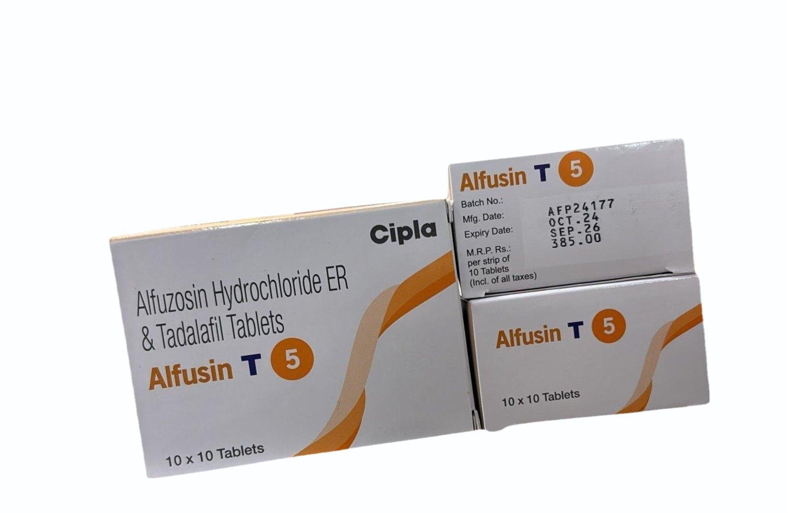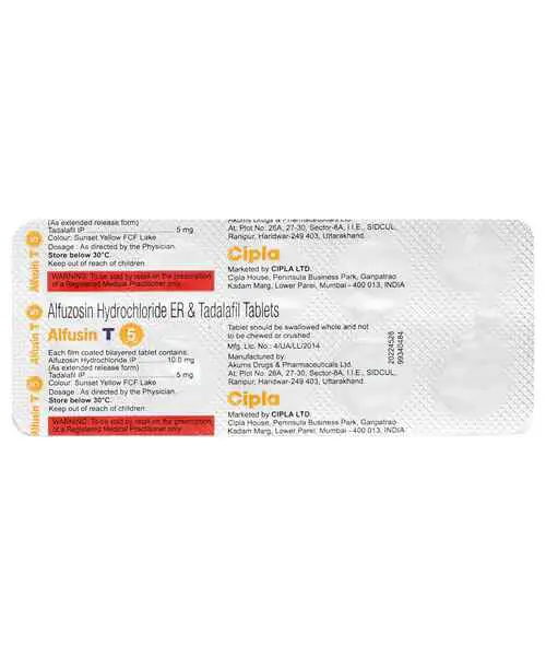 alfusin T 5 Tablet ER is a prescription medication used for the management of benign prostatic hyperplasia (BPH)—a noncancerous enlargement of the prostate gland that commonly affects older men. This condition can lead to urinary problems such as weak urine flow, frequent urination (especially at night), or difficulty starting urination. By combining two active ingredients with complementary actions, this medicine helps restore urinary flow and provides effective relief from BPH symptoms.