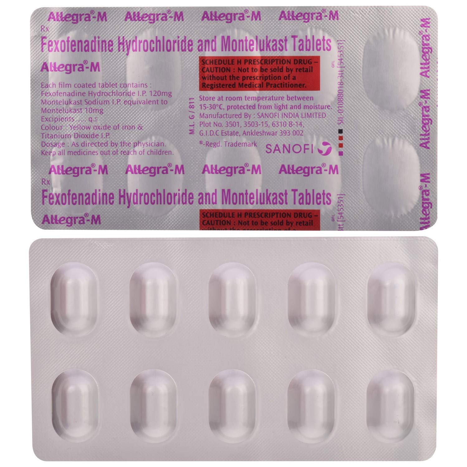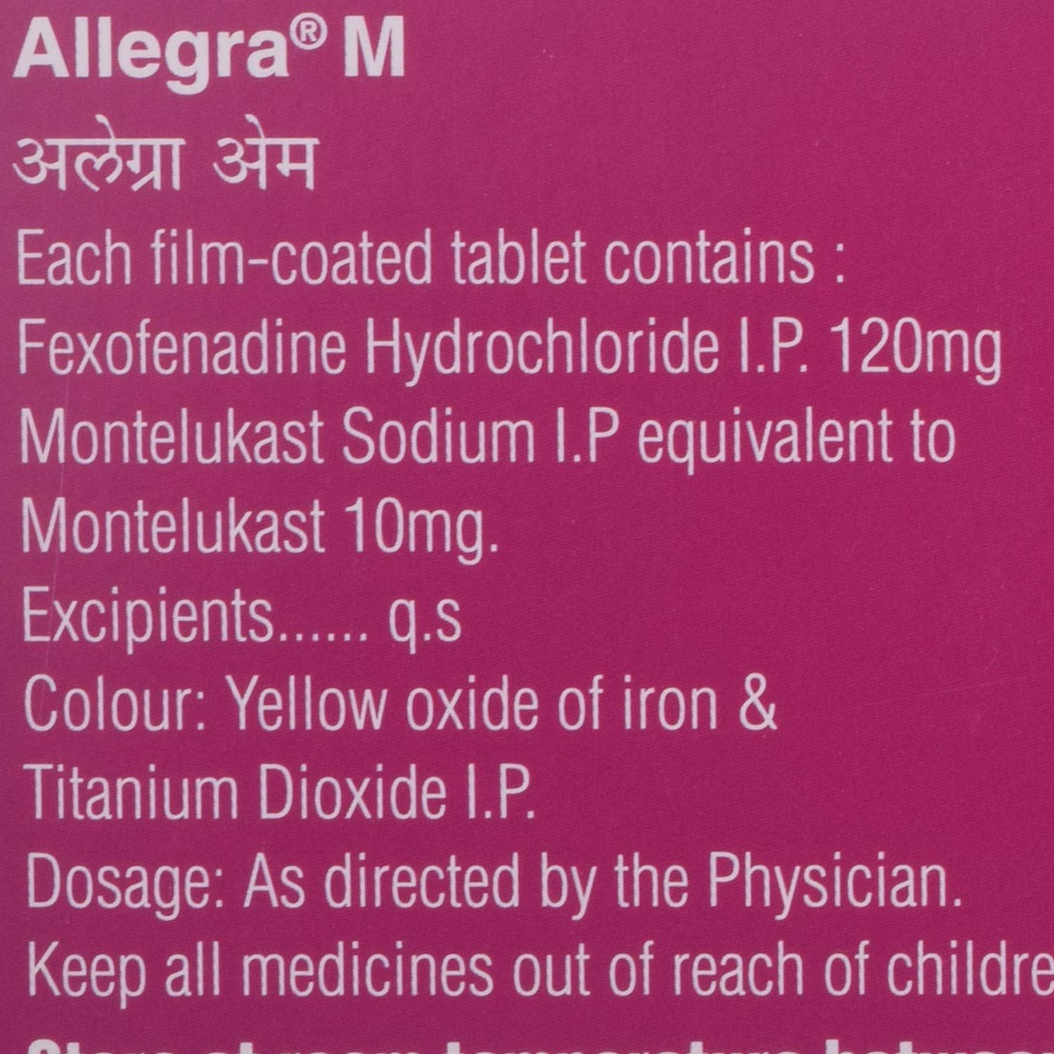 Allegra-M Tablet is an antiallergic medicine that contains Fexofenadine and Montelukast. It is prescribed to treat allergic rhinitis, hay fever, sneezing, runny or stuffy nose, itchy or watery eyes, and skin allergies like hives. It also helps prevent asthma symptoms triggered by allergens.