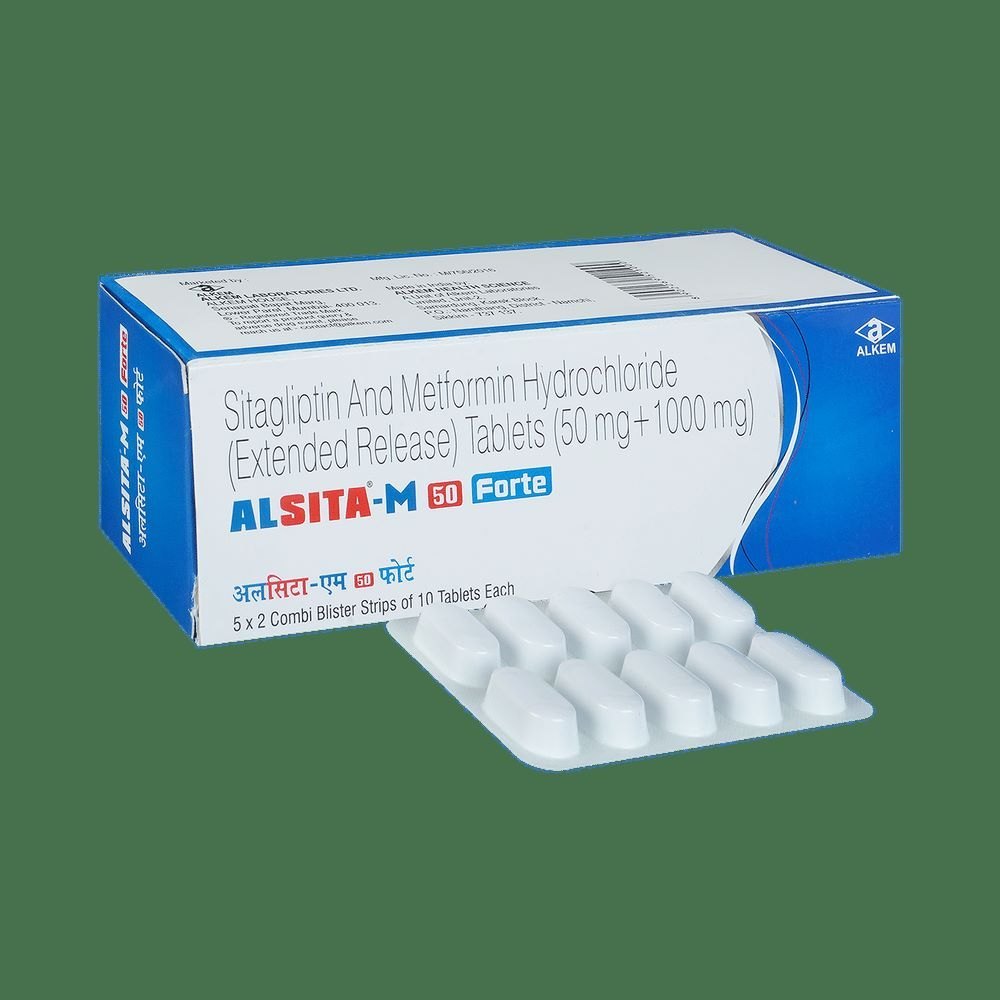 Alsita-M 50 Forte Tablet ER combines two active ingredients designed to help manage elevated blood sugar levels in individuals with type 2 diabetes mellitus. Proper control of blood glucose helps to prevent serious complications like kidney damage, vision problems, and may lower the risk of heart attacks or strokes.
