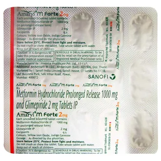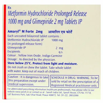 Amaryl M Forte 2mg Tablet PR is an anti-diabetic medication used for managing type 2 diabetes in adults. It combines Glimepiride and Metformin to help regulate blood sugar levels, reducing the risk of complications such as kidney damage, eye problems, nerve damage, and heart issues.
