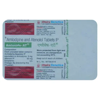 Amlosafe-AT Tablet is a combination medicine used to manage high blood pressure and certain heart-related conditions. It contains two active ingredients: amlodipine, which relaxes blood vessels to improve blood flow, and atenolol, which slows down the heart rate and reduces the heart’s workload. Together, they help in controlling blood pressure, reducing chest pain (angina), and lowering the risk of complications such as heart attack and stroke.