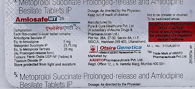 Amlosafe MT 25 Tablet PR is a combination medicine used to manage high blood pressure and certain heart conditions. It works by relaxing blood vessels and slowing down the heart rate, which together lower blood pressure, improve circulation, and reduce the strain on the heart. Regular use helps prevent complications like heart attack, stroke, and heart failure.