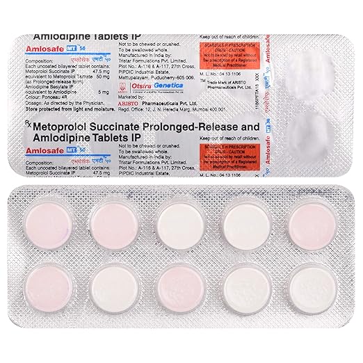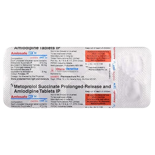 Amlosafe MT 50 Tablet PR is a prescription medicine that combines two active ingredients to control high blood pressure and manage certain heart-related problems. It works by widening blood vessels and reducing the heart’s workload, which improves blood flow and keeps blood pressure under control. Regular use helps lower the risk of serious complications such as heart attack, stroke, and heart failure.