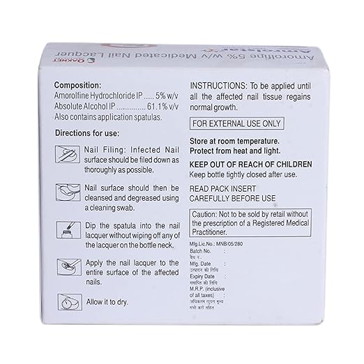 Clean and dry the affected nails before applying the lacquer. Apply a thin coat evenly over the entire nail and allow it to dry. It is usually applied once daily or as advised by your doctor. Regular trimming of the infected part of the nail may speed up recovery. Continue treatment for the full recommended course, as fungal nail infections often take several months to clear completely.