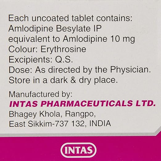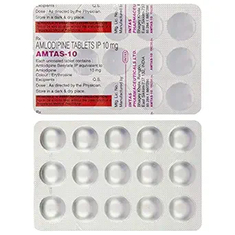 Amtas 10 Tablet is a medication from the class of calcium channel blockers. It is commonly used for managing high blood pressure (hypertension) and preventing angina, which is chest pain related to heart issues. By lowering blood pressure and reducing strain on the heart, this medicine helps lower the risk of serious conditions such as heart attacks and strokes.