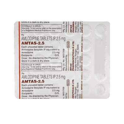 Amtas 2.5 Tablet belongs to the group of medicines known as calcium channel blockers. It is commonly prescribed to manage high blood pressure (hypertension) and to prevent angina, which is chest pain caused by reduced blood flow to the heart. By relaxing the blood vessels, this medicine helps reduce the heart’s workload and lowers the risk of serious health problems such as heart attacks and strokes.