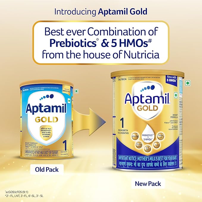 Aptamil Gold Stage 1 Infant Formula is a carefully developed nutritional powder created for infants from birth up to six months of age. It is enriched with prebiotic fibres along with human milk oligosaccharides, which together help in supporting a baby’s digestive health while also providing balanced nutrition needed in the early months of life. The formula contains essential vitamins, minerals, and carefully selected ingredients such as partially skimmed milk, whey, vegetable oils, lactose, galacto-oligosaccharides, fructo-oligosaccharides, DHA, arachidonic acid, and other nutrients that contribute to healthy physical growth as well as the development of brain and vision. With its unique blend, the formula also helps to strengthen the immune system of infants, giving them added support during their formative months.
