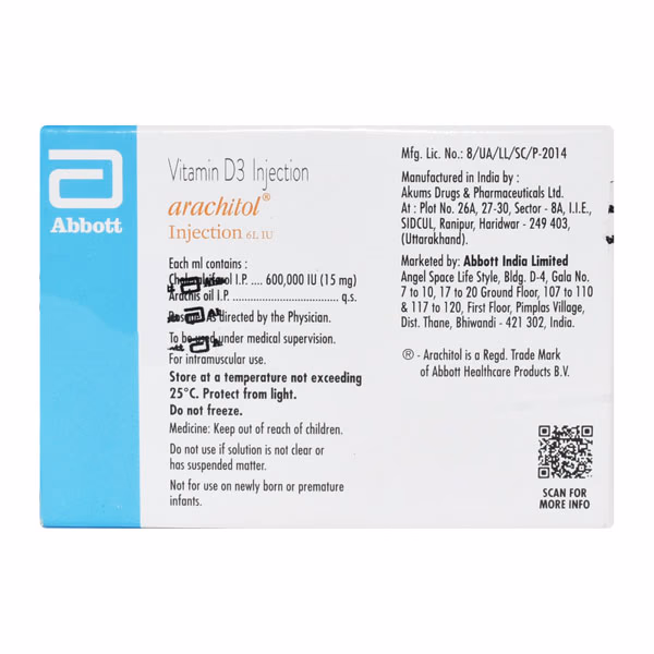 Arachitol 6L Injection is a high-dose vitamin D supplement that supports calcium absorption in the body—essential for maintaining healthy, strong bones. It is typically prescribed when dietary intake alone is insufficient or in conditions caused by vitamin D deficiency, such as osteoporosis.