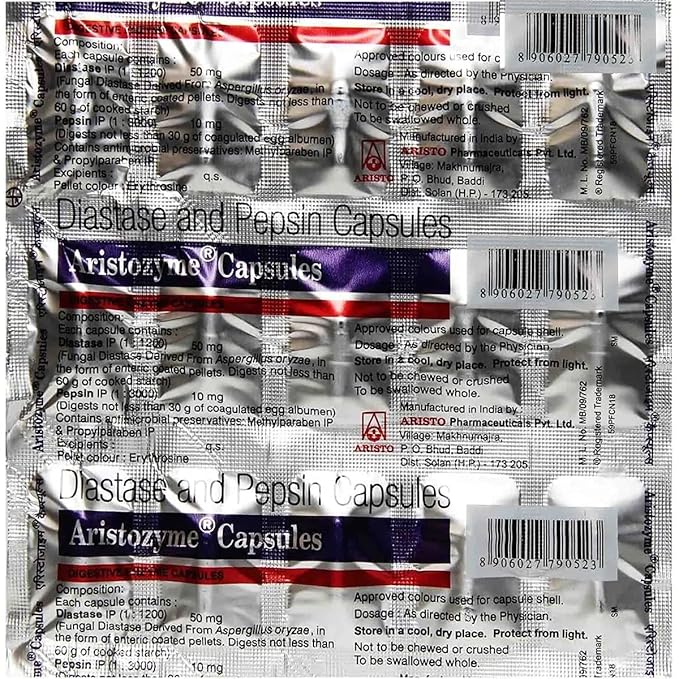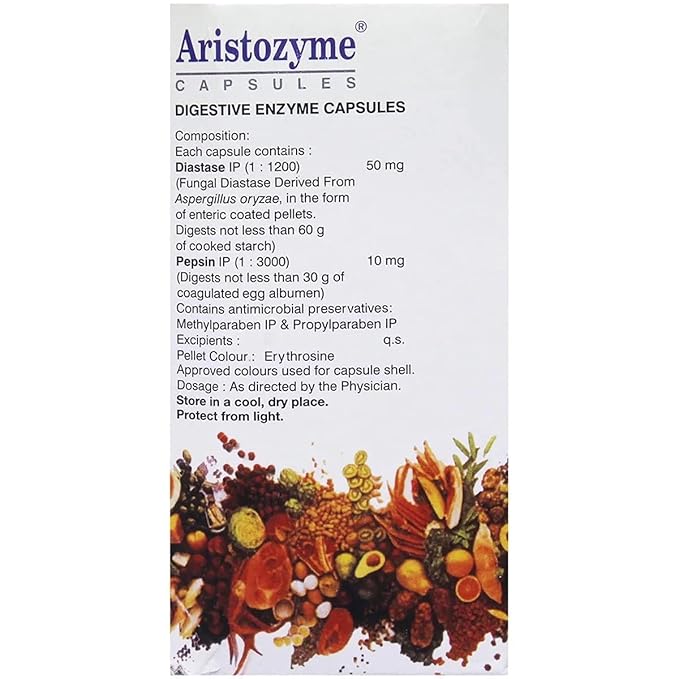 Keywords: Aristozyme Capsule, Aristozyme Digestive Capsule, Aristozyme Enzyme Supplement, Aristozyme for Digestion, Aristozyme for Acidity Relief, Aristozyme with Fungal Diastase and Pepsin, Aristozyme Appetite Booster, Buy Aristozyme Capsule Online, Aristozyme Capsule Benefits