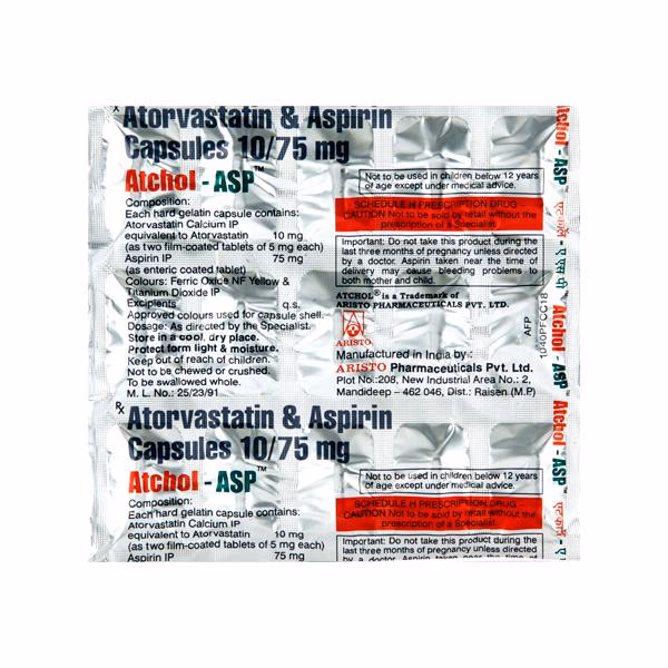 Atchol-ASP Capsule is a medicine prescribed to lower the chances of heart attack and stroke. These conditions usually occur when blood flow to the heart or brain gets obstructed due to fatty deposits, cholesterol, or other substances that form plaque inside the arteries. By managing cholesterol and reducing clot formation, this capsule helps protect the heart and circulation system.