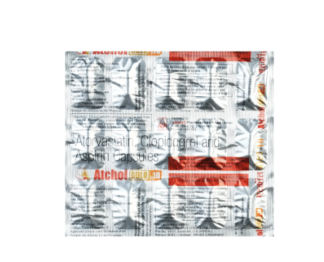 Atchol Gold 10 Capsule is a prescription medicine that combines three active ingredients to help reduce the risk of heart attack. It works by lowering cholesterol levels and preventing the formation of harmful clots in the blood vessels. This dual action supports overall heart and vascular health.