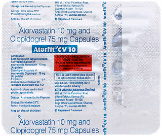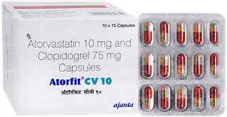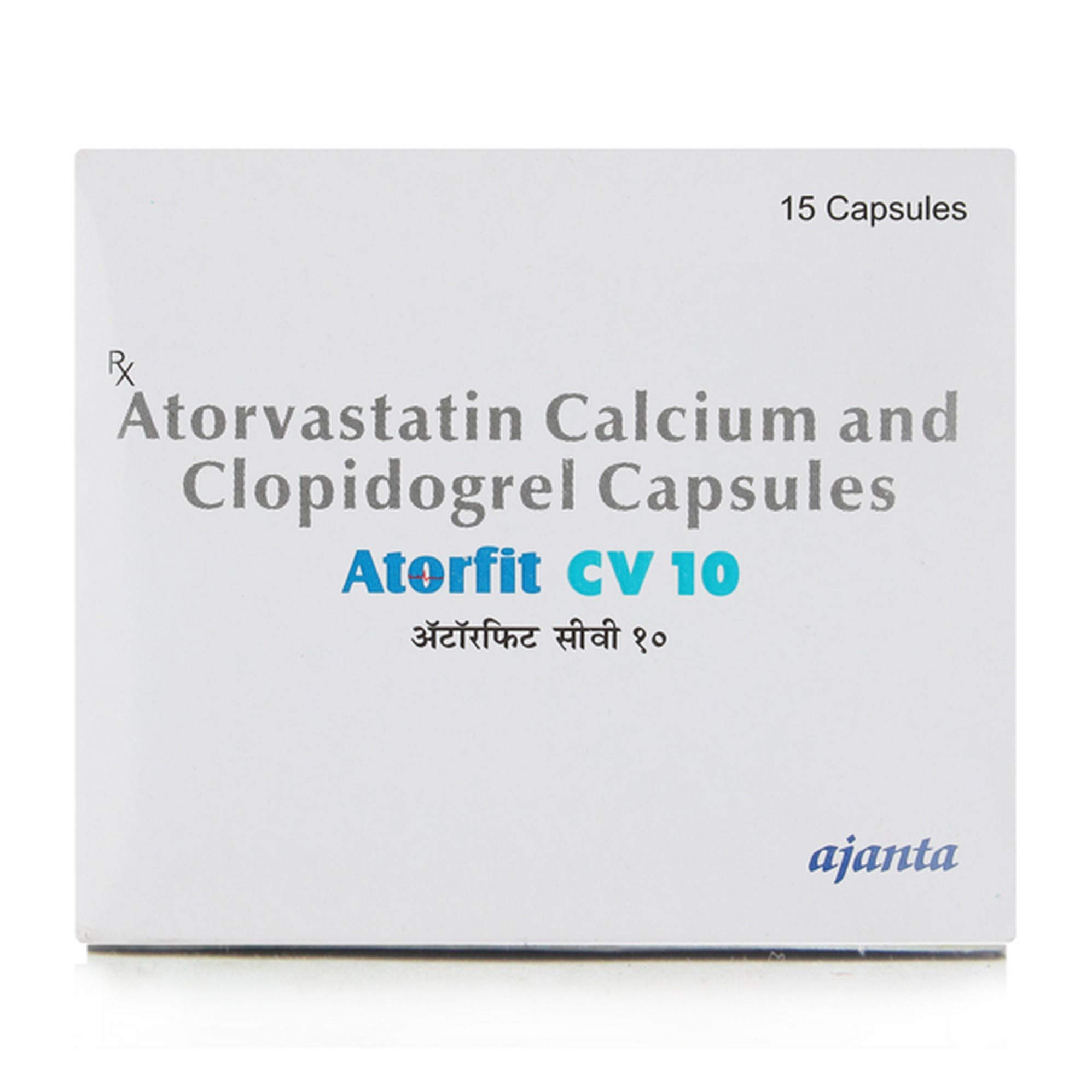 Atorfit CV 10 Capsule is a combination medication used to help reduce the risk of heart attacks and strokes while managing cholesterol levels. It contains Atorvastatin, which lowers bad cholesterol (LDL) and triglycerides and increases good cholesterol (HDL), and Clopidogrel, which works by preventing blood clots. This dual-action helps protect against cardiovascular events. The medicine should be taken with food to reduce stomach discomfort and must be used regularly as prescribed. Common side effects may include stomach pain, diarrhea, indigestion, headache, dizziness, muscle pain, and fatigue, though these are usually temporary. It is important to avoid alcohol during treatment, and use is not advised in pregnancy or while breastfeeding. Patients with liver problems should use caution. If a dose is missed, it should be taken as soon as remembered unless it is close to the next scheduled dose. In such cases, skip the missed dose without doubling up. This medicine should always be used under medical supervision for best results.