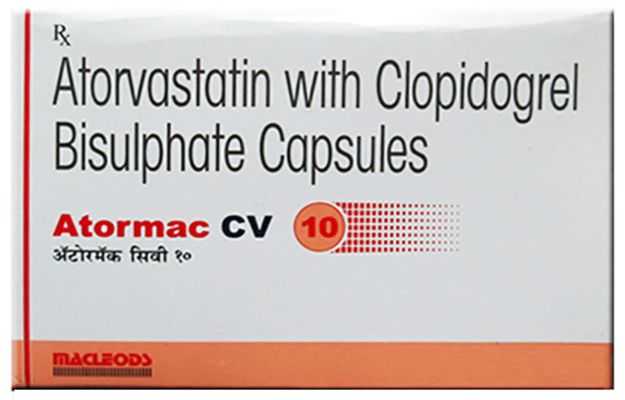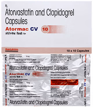 Atormac CV 10 Capsule is a prescription medicine used for the prevention and management of heart and blood vessel-related disorders. It is a fixed-dose combination that generally contains Atorvastatin, a cholesterol-lowering medicine, and Clopidogrel, an antiplatelet agent. Atorvastatin works by reducing the production of bad cholesterol and triglycerides while increasing good cholesterol in the body, thereby keeping blood vessels clear and healthy. Clopidogrel helps prevent blood clots by stopping platelets from sticking together, reducing the risk of stroke and heart attack. Together, they provide powerful protection for individuals with high cholesterol, high cardiovascular risk, or those who have already experienced heart-related events. Atormac CV 10 Capsule should be taken regularly as advised by the doctor along with lifestyle modifications such as a balanced diet, exercise, weight control, and avoidance of smoking and alcohol for best results.