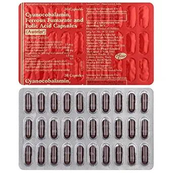 Autrin Capsule, Iron + Folic Acid + Vitamin B12 Supplement, Hematinic Capsule, Iron Deficiency Anemia Treatment, Energy Booster Supplement.