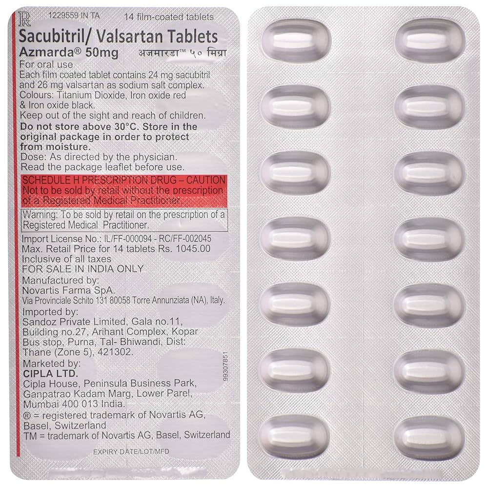 Heart failure occurs when the heart becomes weak and cannot pump blood efficiently to meet the body’s needs. Symptoms often include shortness of breath, fatigue, and swelling in the legs, ankles, or other parts of the body. Azmarda 50mg Tablet combines two active components, sacubitril and valsartan, which work together to lower blood pressure and make it easier for the heart to pump blood.