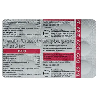 Formulated with key nutrients like Methylcobalamin (Vitamin B12), Alpha Lipoic Acid, Vitamin B6, Vitamin D3, and Folic Acid, B 29 Tablet helps in the production of red blood cells, enhances nerve repair, supports calcium absorption, and protects vital organs from oxidative stress.