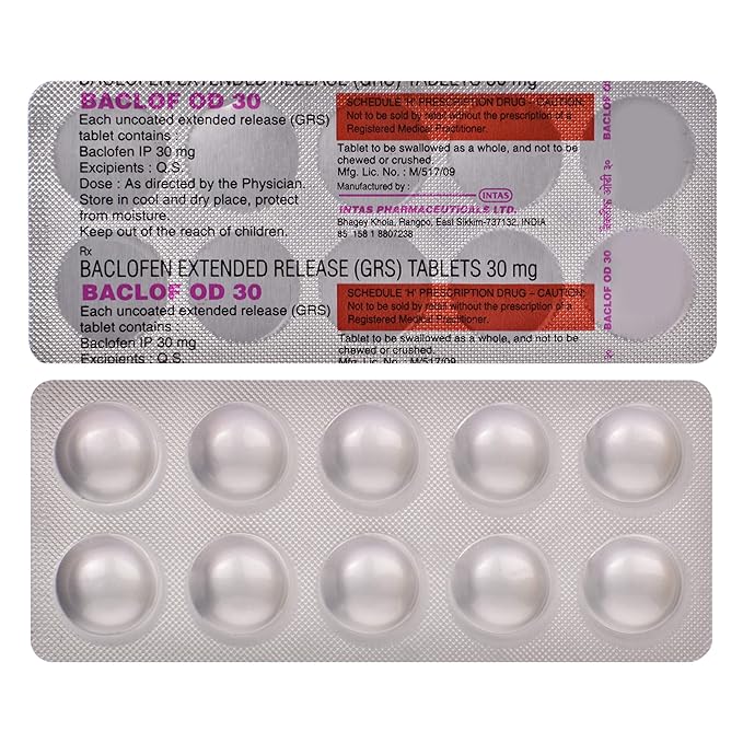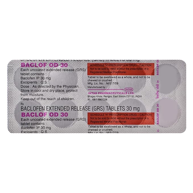 Baclof OD 30 Tablet ER is a prescription muscle relaxant designed to relieve stiffness, tension, and rigidity in skeletal muscles. It is commonly used in conditions such as cerebral palsy, multiple sclerosis, motor neuron disease, and injuries affecting the brain, head, or spinal cord. By targeting nerve signals in the brain and spinal cord, Baclof OD 30 Tablet ER helps reduce muscle spasms, ease discomfort, and improve mobility.