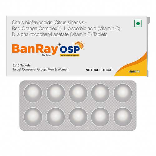 Banray OSP Oral Sun Protection Nutraceutical Tablet is a dietary supplement designed for both men and women to support skin health from the inside out. Enriched with a powerful blend of red orange extract, Vitamin C, and Vitamin E, this tablet helps shield the skin from damage caused by ultraviolet (UV) rays. It works to combat oxidative stress, reduce signs of sun damage, and promote a clear, even complexion.