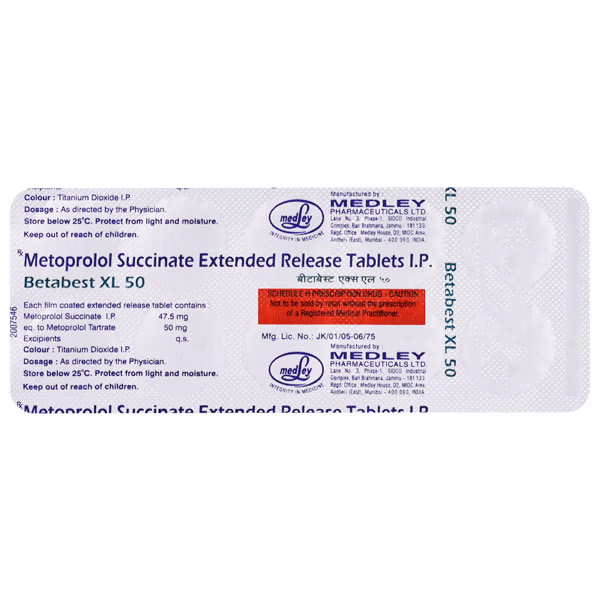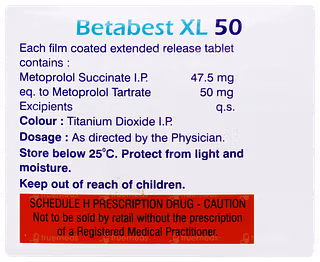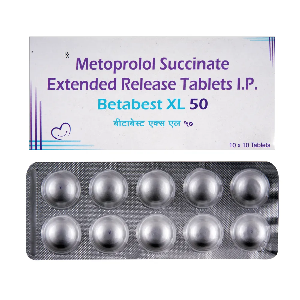 Betabest XL 50 Tablet is a beta-blocker medicine containing Metoprolol Succinate (extended-release) 50 mg. It is commonly prescribed to treat high blood pressure, chest pain (angina), irregular heartbeat, and heart failure. By slowing the heart rate and relaxing blood vessels, it reduces strain on the heart and improves blood circulation. Its extended-release formulation provides steady control with once-daily dosing.