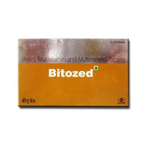 Bitozed Tablet is a nutritional supplement formulated to support healthy hair growth and enhance overall hair quality. It is designed to strengthen hair strands, promote shine, and protect against damage caused by environmental factors like sunlight, heat, and chemical treatments. This supplement can be beneficial for individuals experiencing hair fall, brittle or dull hair, and changes in hair texture due to nutritional imbalances or stress. It works by supplying essential vitamins, minerals, and antioxidants that contribute to healthier, more resilient hair.
