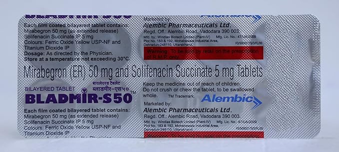 Bladmir-S 50 Tablet ER combines Mirabegron and Solifenacin to target bladder overactivity from two angles. Mirabegron, a beta-3 receptor agonist, relaxes bladder muscles and increases urine storage capacity. Solifenacin, an antimuscarinic agent, further eases muscle spasms in the bladder. Together, these ingredients help control urgency, frequency, and involuntary urination, improving overall urinary comfort.