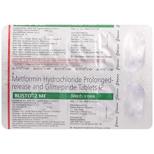 Blisto 2 MF Tablet PR is intended for adults diagnosed with type 2 diabetes mellitus requiring assistance to manage blood sugar. It is not suitable for type 1 diabetes, diabetic ketoacidosis, or patients with severe kidney or liver impairment. Pregnant or breastfeeding women should consult their healthcare provider before use.