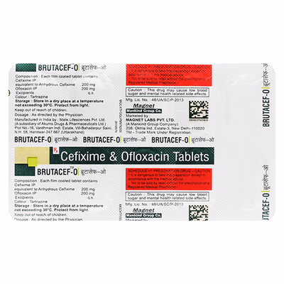 Brutacef O Tablet combines Cefixime and Ofloxacin. Cefixime kills bacteria by preventing the formation of their protective covering, while Ofloxacin stops bacterial growth and repair. Together, they effectively control and clear bacterial infections.