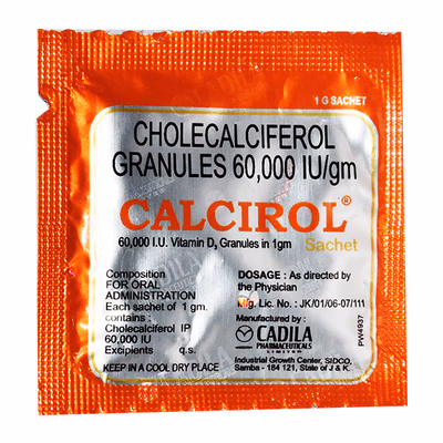Calcirol Sachet is a vitamin D3 supplement designed to manage vitamin D deficiency and support strong, healthy bones. It improves calcium and phosphorus absorption from the gut, helping maintain bone density and overall skeletal health. This supplement is especially useful for people with osteoporosis, bone disorders, or limited exposure to sunlight.