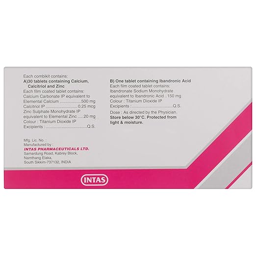 This kit contains four active ingredients: Calcium, Calcitriol, Zinc, and Ibandronic Acid. Calcium and Calcitriol aid in the absorption and strengthening of bones. Zinc plays a vital role in bone growth and repair. Ibandronic Acid works by slowing down the activity of bone cells that break down bone tissue, leading to improved bone density and reduced fracture risk.
