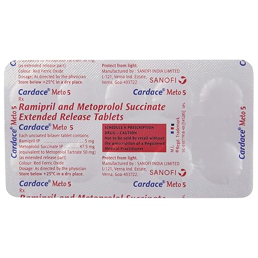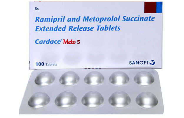 Cardace Meto 5 Tablet ER contains Ramipril, an ACE inhibitor, and Metoprolol, a beta-blocker. Ramipril relaxes blood vessels so blood can flow more freely, while Metoprolol slows down the heart rate and reduces the force of contraction. Together, they lower blood pressure and protect the heart.
