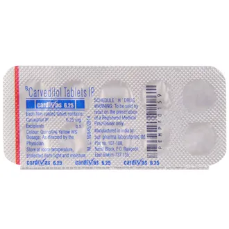 Cardivas 6.25 Tablet is a prescription medicine that helps in treating high blood pressure, heart failure, and chest pain related to the heart (angina). It works by relaxing the blood vessels, allowing the heart to pump blood more efficiently and reducing strain on it. By lowering blood pressure, this medicine helps prevent future heart attacks, strokes, and related complications.