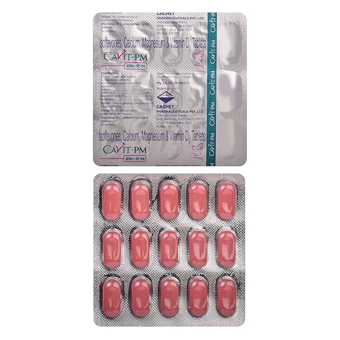 Cavit-PM Tablet is a specially formulated supplement designed to support bone and joint health in women. It combines calcium, vitamin D3, magnesium, and isoflavones to strengthen bones, maintain joint flexibility, and promote overall skeletal wellness.