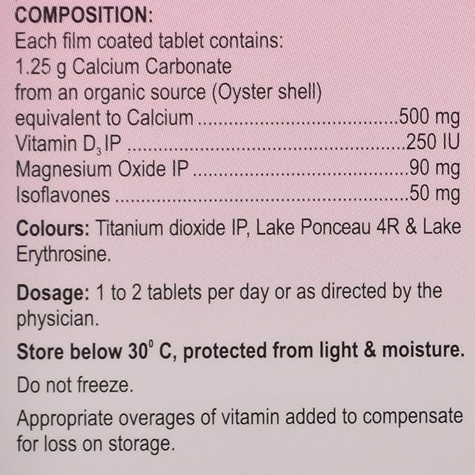 Calcium Carbonate (500 mg) – Essential for strong bones and teeth, muscle function, and cardiovascular health.