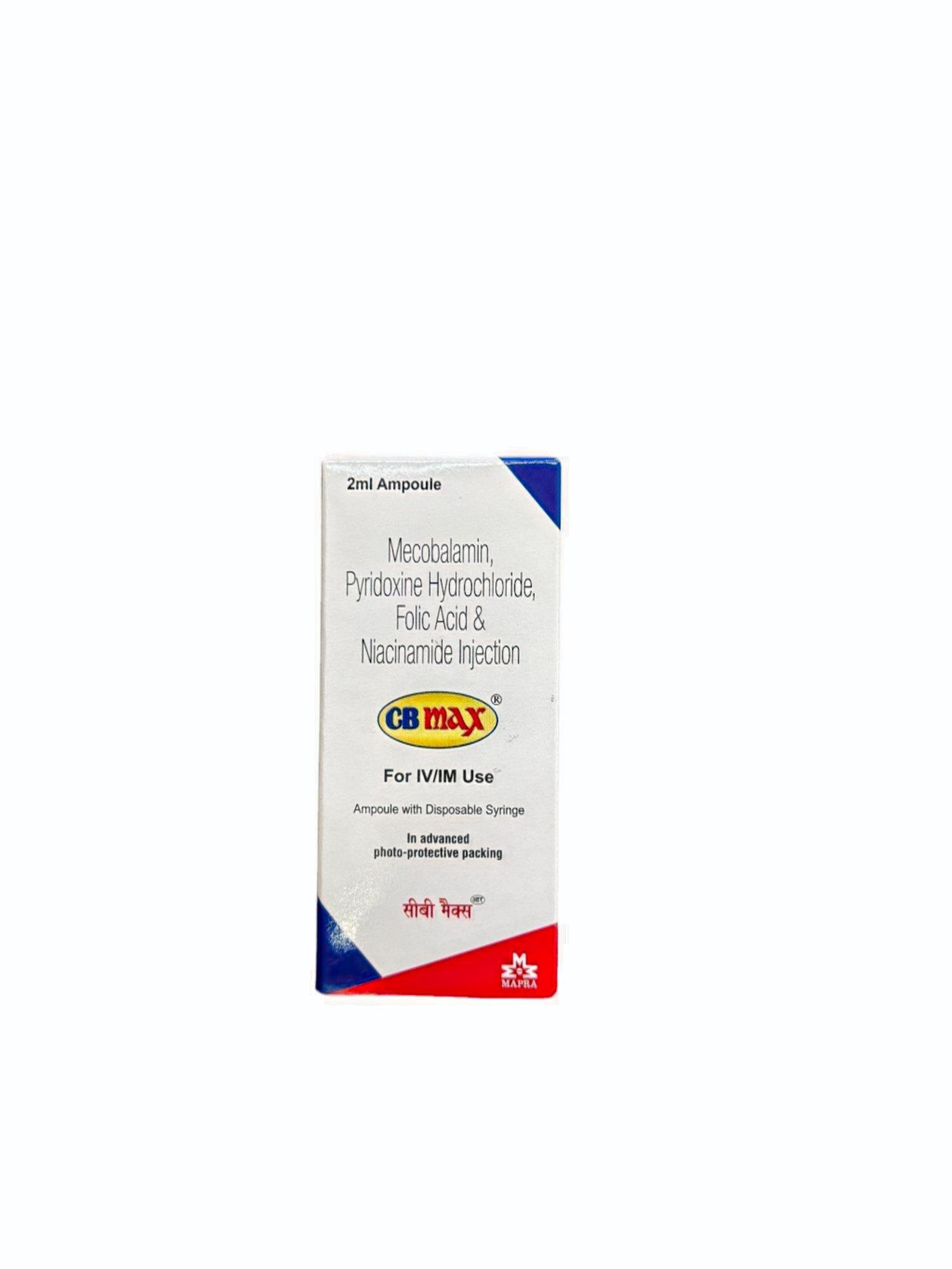 CB Max Injection is a nutritional supplement injection that usually contains Methylcobalamin (Vitamin B12), Niacinamide, and Pyridoxine (Vitamin B6). These nutrients play a vital role in supporting nerve health, improving red blood cell production, and boosting overall energy metabolism. It is generally prescribed in the management of neuropathy, anemia, general weakness, and certain vitamin deficiencies.