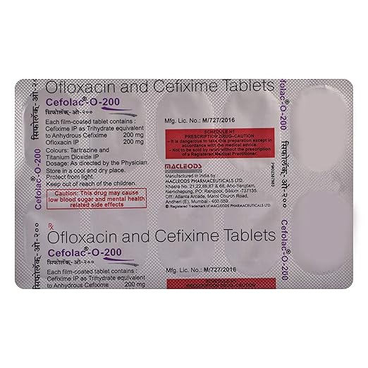 Cefolac-O 200 Tablet is a prescription antibiotic medicine widely used in the treatment of bacterial infections that affect the respiratory tract, urinary tract, ear, throat, sinuses, and certain skin or digestive system infections. It combines two powerful antibiotics, cefixime and ofloxacin, which work together to stop the growth of harmful bacteria and clear infections more effectively. This combination provides broad-spectrum coverage, helping patients recover faster while reducing the risk of bacterial resistance. By targeting the root cause of infection, it helps relieve troubling symptoms like fever, cough, sore throat, breathing difficulty, ear pain, urinary discomfort, and general weakness. The medicine is generally well tolerated when taken under medical guidance, and it plays a vital role in restoring health and preventing recurrence. Completing the full prescribed course is essential for achieving best results and ensuring bacteria are completely eliminated from the body.