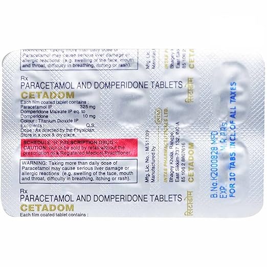 Cetadom Tablet combines two active ingredients: Domperidone and Paracetamol. Domperidone works on a specific area in the brain to prevent nausea and vomiting while improving the movement of the stomach and intestines to help food pass more easily. Paracetamol acts as a pain reliever and fever reducer by blocking chemical messengers that cause migraine-related pain and fever.