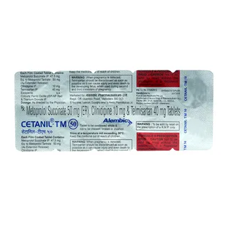 Cetanil-TM 50 Tablet ER is a combination medicine designed for effective management of high blood pressure (hypertension), especially when single-drug therapy is insufficient. By relaxing blood vessels and enhancing heart efficiency, it lowers blood pressure and reduces the risk of heart attacks, strokes, and kidney complications. Long-term, consistent use under medical guidance ensures optimal cardiovascular protection.
