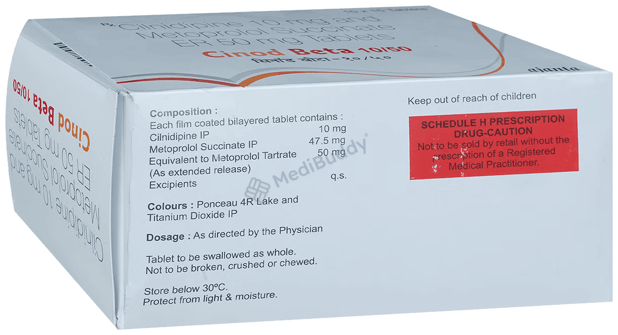 Cinod Beta 10/50 Tablet ER contains two active components that work together to manage high blood pressure by relaxing blood vessels and decreasing the heart rate.