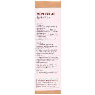 Ciplox D Eye/Ear Drops is used to treat bacterial infections of the eye or ear, as well as inflammatory eye conditions. It works by eliminating and stopping the growth of bacteria responsible for the infection, helping to ease symptoms and promote faster recovery.