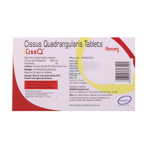 Ciss Q Tablet is a herbal supplement formulated to support bone and joint health. Enriched with Cissus Quadrangularis, a plant known for its medicinal properties, this tablet may help ease inflammation, relieve pain, and promote bone healing. It is also believed to contribute to improved kidney function and overall wellness.